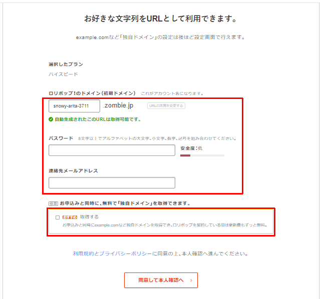 また、ハイスピードプランを12か月以上契約する場合は、お申込みと同時に独自ドメインを取得するにチェックを入れましょう。