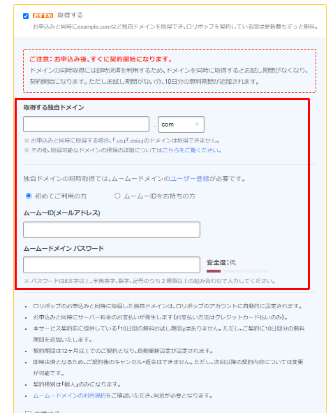 申し込みと同時に独自ドメインを取得する場合は、10日間の無料お試しが10日間の無料期間に変更されます。