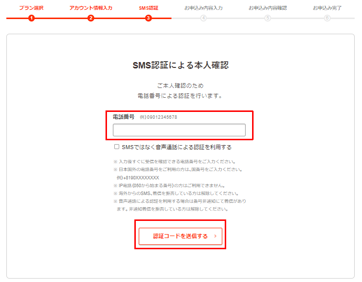 電話番号を入力して「認証コードを送信する」をクリックしてください。