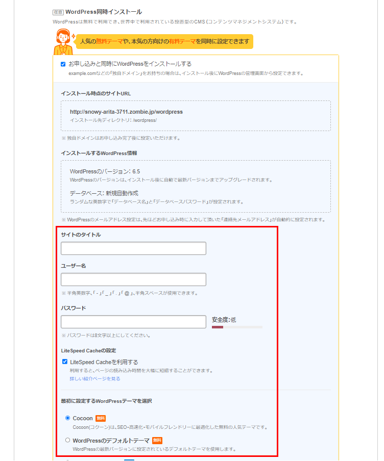 また、申し込みと同時にWordPressをインストールすることもできます。