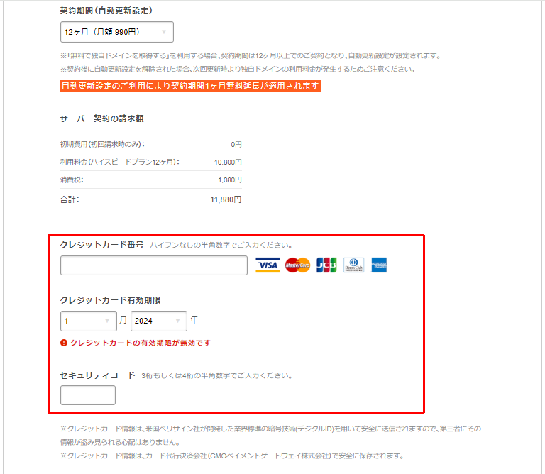 契約期間は12か月以上を選択して、クレジットカード情報を入力しましょう。