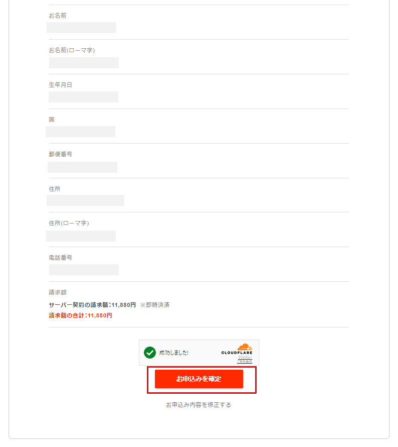 申し込み内容を確認して問題がなければ申し込みを確定します。