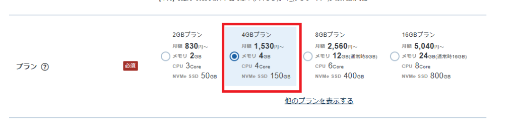 | 4GB | 4コア | 150GB | 2,200円 | 1,800円 | 1,700円 |