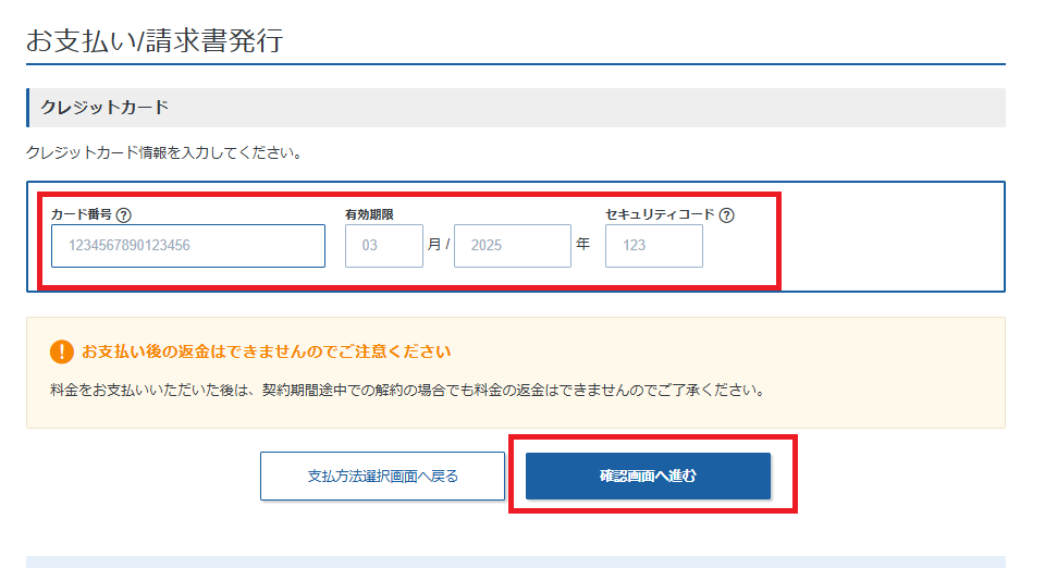 ⑭クレジットカードを選択した場合は、カード番号を入力して「確認画面に進む」をクリックします。