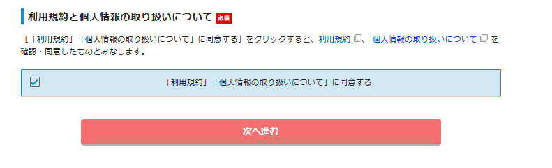 ④すべて入力したら利用規約と個人情報の取り扱いに同意して「次へ進む」ボタンを押します。