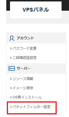 ②画面左のメニュー一覧から「パケットフィルター設定」をクリックします。