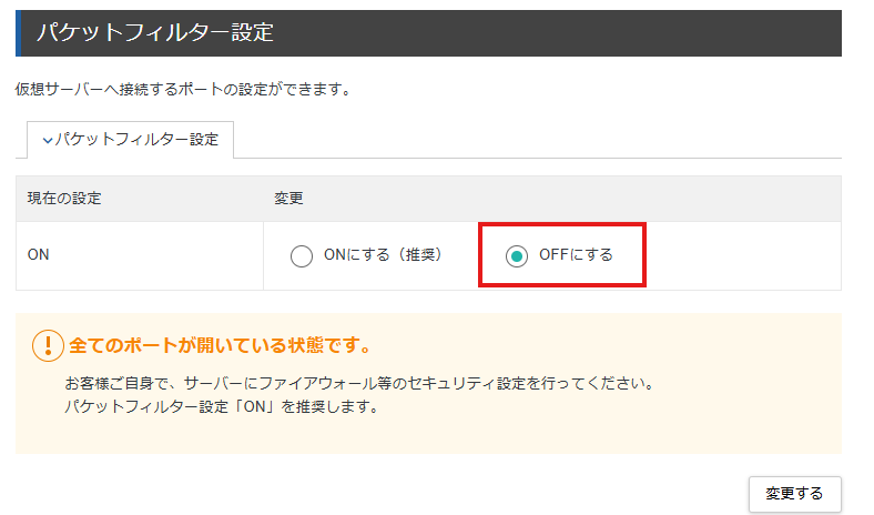このあと設定するSSLの設定をするためには、パケットフィルターを無効化する必要があります。