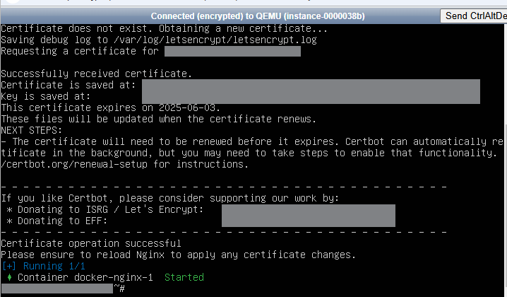 ④「Successfully received certificate」と表示されればSSL証明書の設定は完了です。