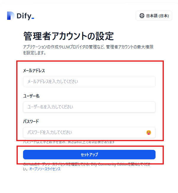 ②Dify管理者アカウントの設定画面でメールアドレス、ユーザ名、パスワードを入力して「セットアップ」をクリックします。