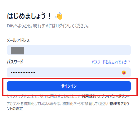 Difyへの初期アクセス時に管理者アカウントを作成します。