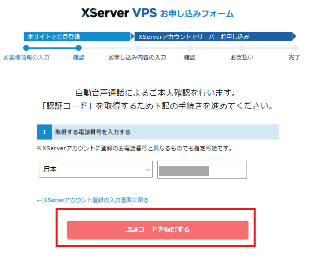 ⑧指定した電話に電話がかかってくるので認証コードを聞いて入力します。その後「認証してサーバー申し込みに進む」ボタンをクリックします。