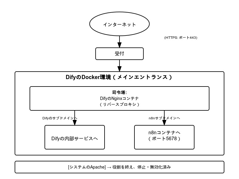 - アクセスされたドメイン名に応じて、Difyの内部サービスかn8nコンテナにリクエストを振り分けます。